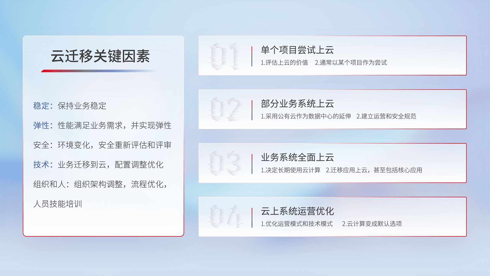 结合实际业务,,,,从规划设计、、、云平台选型、、、云原生改造、、数据迁移、、、、集成交付,,,,迁移全过程为客户识别最佳上云路径,,做好风险识别管理,,,,设计网络架构、、、、身份权限、、、安全审计合规、、操作审计、、、、日志审计、、、、监控告警策略、、、多站点容灾设计等,,对云上基础设施进行整体规划,,,,提升IT治理水平,,,,以满足弹性、、、高可用、、、高性能的需求。。。。
