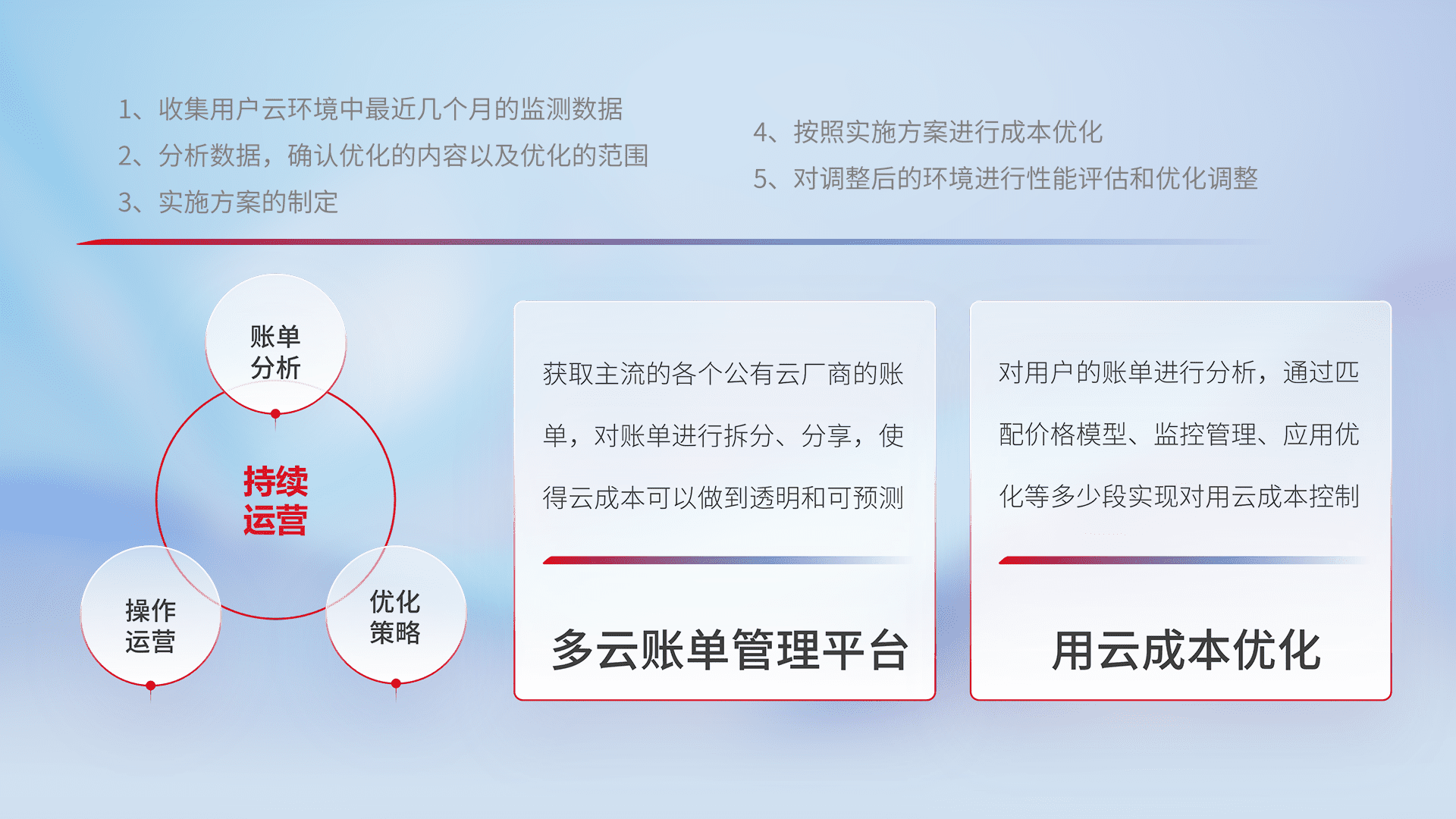 通过多云纳管,,,,以统一的资源数据模型把客户的云资源进行抽象和封装,,进而实现对多云资源的统一操作,,保障云资源管理的可靠性、、、稳定性与可用性。。。。量身定制化运维内容,,,,配置、、、开发运维、、、补丁管理、、、、备份、、、、监控、、、、认证和访问管理、、审计和日常巡检等,,保障在用云过程中的可靠度,,,,稳定度以及高可用率。。。。